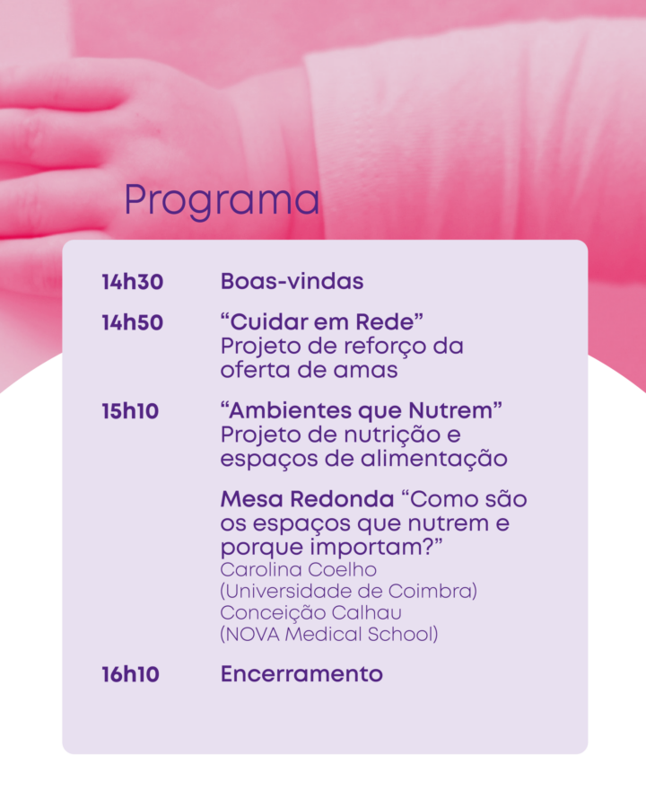 Será também apresentado o documento “Ambientes que Nutrem”, uma ferramenta de capacitação e promoção da literacia nas áreas da alimentação. Numa mesa redonda, as oradoras Carolina Coelho, da Universidade de Coimbra, e Conceição Calhau, da NOVA Medical School, reúnem-se para refletir sobre a importância da nutrição e dos espaços de alimentação, recomendando boas práticas que contribuem para a saúde, bem-estar, equidade e autonomia das crianças.